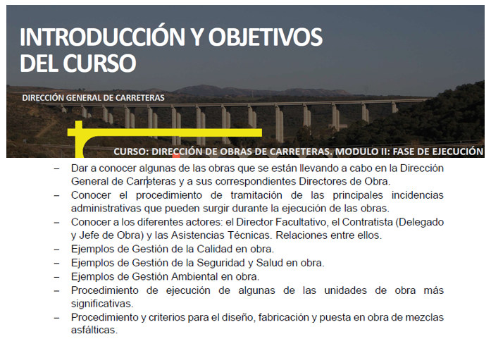 El objetivo general del curso es que los alumnos conozcan cómo se llevan a cabo en la práctica, las funciones de Director Facultativo que se encuentran diseminadas en diferentes textos normativos (PCAG, Ley 9/2017, de 8 de noviembre, de Contratos del Sector Público, Normativa sobre Prevención de Riesgos Laborales y Medioambiental).
